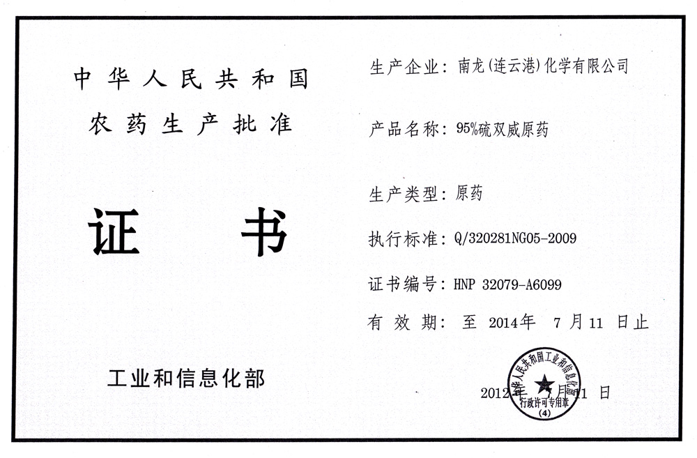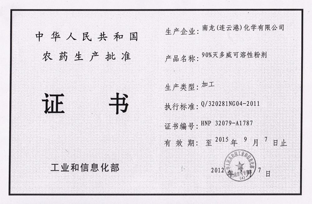 ¡¡¡¡Production approval certificate: 90% methomyl powders £¨HNP32079-A1787£©