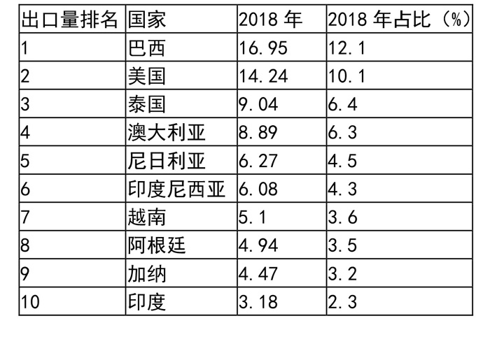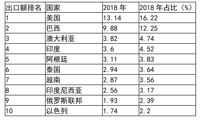2018年出口目標(biāo)市場TOP10國家和地區(qū)合計出口79.1萬噸,占出口總量的56.3%(表2)。