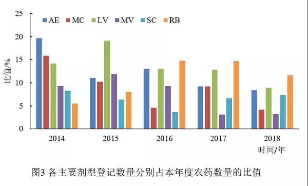 2.2.2 環(huán)境友好型劑型種類增多 衛(wèi)生用農(nóng)藥劑型約有50多個,其中六大劑型仍占主導(dǎo)地位,分別為氣霧劑、蚊香、電熱蚊香液、電熱蚊香片、懸浮劑、餌劑。環(huán)境友好型劑型懸浮劑2014-2016年的比值在降低,年均下降率為32.6%,而2016-2018年的比值在持續(xù)上升,年均增長率為45.8%,總體來看,懸浮劑仍然呈現(xiàn)上升趨勢。值得注意的是,近5年餌劑的品種和數(shù)量發(fā)展迅速,年均增長率為27.1%。因氣霧劑、蚊香、電熱蚊香液、電熱蚊香片在使用過程中會產(chǎn)生VOCs和PM2.5,影響人民的健康和安全,近5年這四種劑型的比值均呈下降趨勢,年均降低率依次分別為16.1%,11.3%,7.3%,14.3%。 另外,每年新增農(nóng)藥登記中環(huán)境友好劑型的種類也在增多,除常規(guī)的懸浮劑、餌劑外,還有水分散粒劑,驅(qū)蚊液,驅(qū)蚊乳,揮散芯,長效防蚊帳等。