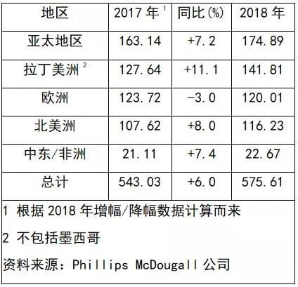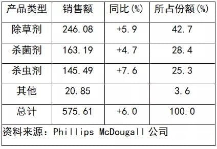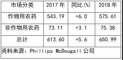 據(jù)Phillips McDougall公司的統(tǒng)計(jì)數(shù)據(jù),2018年全球作物用農(nóng)藥市場(chǎng)的銷售額為575.61億美元,同比增長(zhǎng)6%;剔除通貨膨脹和匯率波動(dòng)的影響后,同比增長(zhǎng)4.9%。如果包括非作物用農(nóng)藥在內(nèi),2018年全球農(nóng)藥銷售額達(dá)650.99億美元,同比增長(zhǎng)5.6%。其中,非作物用農(nóng)藥的銷售額為75.38億美元,同比增長(zhǎng)3.1%。